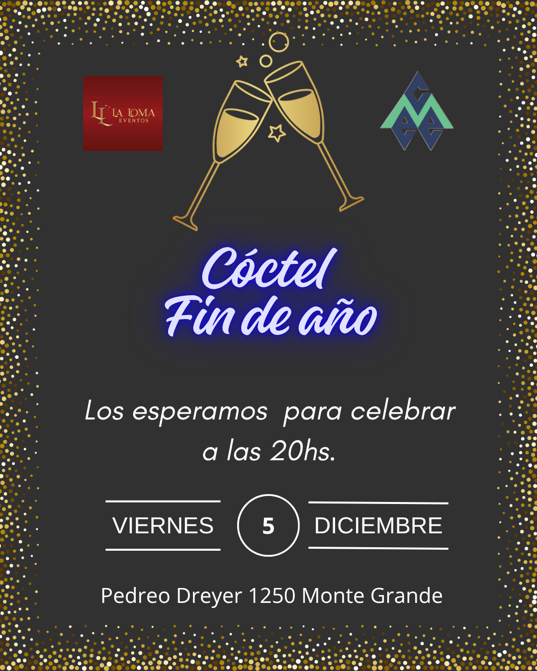 El Circulo Medico de Esteban Echeverría tiene el agrado de comunicarles, que el día VIERNES 5 DE DICIEMBRE A LAS 20 horas, en el Predio La Loma, se realizara el CÓCTEL de FIN DE AÑO.